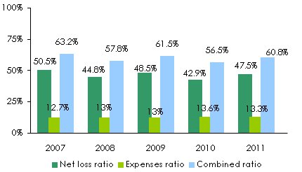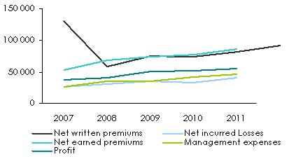 Evolution of premiums, losses, management expenses and results 2007-2011