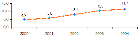 - Penetration rate (2004): 0.25%