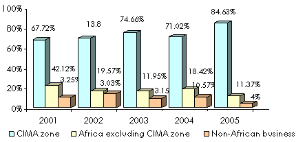 in millions USD| Zone | 2001 | % | 2002 | % | 2003 | % | 2004 | % | 2005 | % |