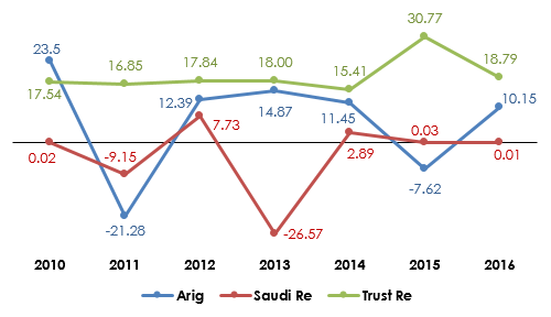 Arig vs Saudi Re vs Trust Re: evolution of net result (2010-2016)