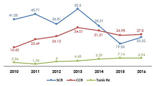CCR vs SCR vs Tunis Re: evolution of net result (2010-2016)