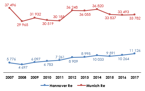 Hannover Re vs Munich Re : evolution of turnover (2007-2017)