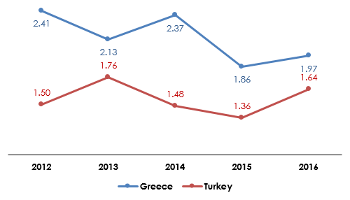 Turkey vs Greece: evolution of insurance penetration rate (2012-2016)