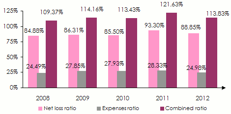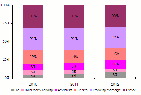 Like most developing countries, it is the motor class which dominates, accounting for 30% of the market in 2012. Property damage and health classes follow with 28% and 17% respectively.