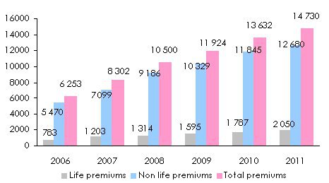 The premiums volume generated by Gulf countries reached 14.730 billion USD in 2011. During the 2006-2011 period, overall premiums multiplied by 2.35, which corresponds to an average annual growth rate of 18.7%, with life insurance increasing by 21.2% and non-life insurance reporting an 18.3% rate.