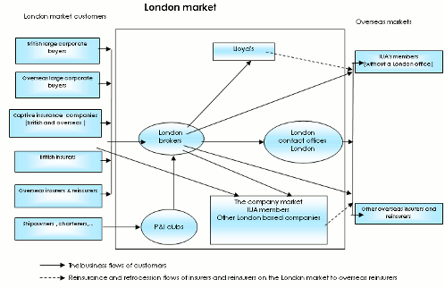 The London market is basically a brokerage and coinsurance market. The major players are therefore the clients, the brokers, the insurers pooling up within IUA, the P&I clubs and the Lloyd's syndicates.