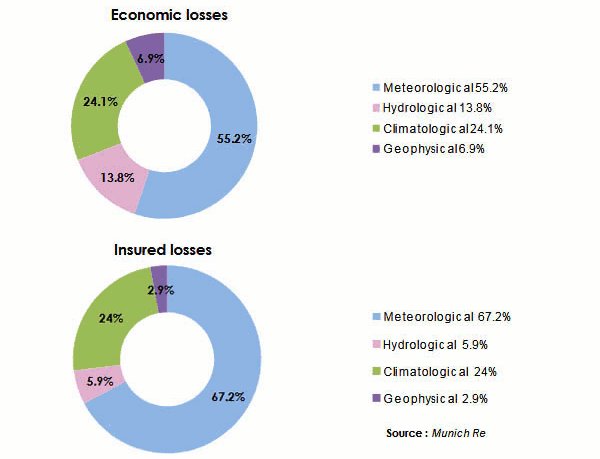 North America and especially the United States were the hardest hit in terms of economic and insured losses. This trend is accounted for by the high rate of insurance penetration in this part of the world.