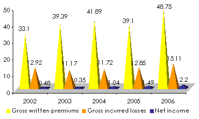 in USD| Written premiums | 2002 | % | 2003 | % | 2004 | % | 2005 | % | 2006 | % |
