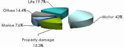 in USD| Motor | Property damage | Marine | Others | Non life total | Life | Grand total | Share (%) | 2007/08 growth | |