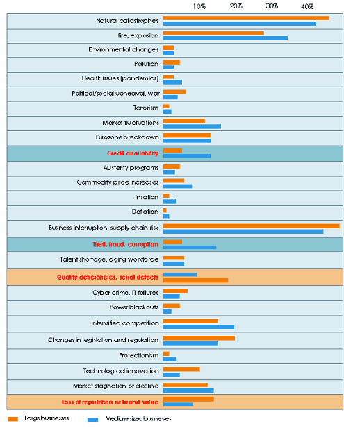 Source: Allianz Global Corporate & Specialty This table gathers the responses of the companies polled by Allianz Global Corporate & Specialty. The questionnaire was sent to 456 large companies and 387 medium-sized enterprises.
