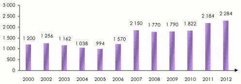 | 2012 | 2 389 | 5 283 | 4 904 | 12 576 |