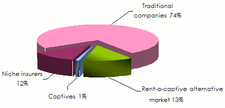 74% of the non life operations are carried out by traditional insurance companies. Niche insurers and the various captives along with similar entities are reporting 26% of the overall non life turnover in 2012.