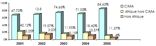 Afrique hors CIMA | 3,15 | 22,11 | 3,33 | 16,58 | 5,10 | 16,30 | 6,38 | 18,42 | 2,93 | 11,37 |