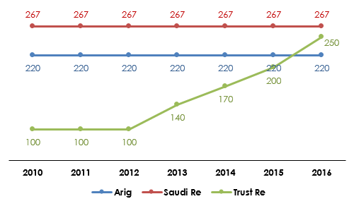 Arig vs Saudi Re vs Trust Re : évolution du capital social (2010-2016)