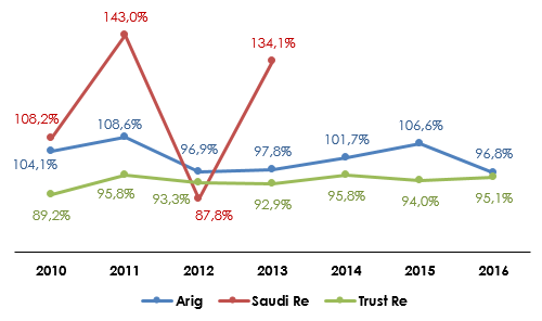 Arig vs Saudi Re vs Trust Re : évolution du ratio combiné (2010-2016)