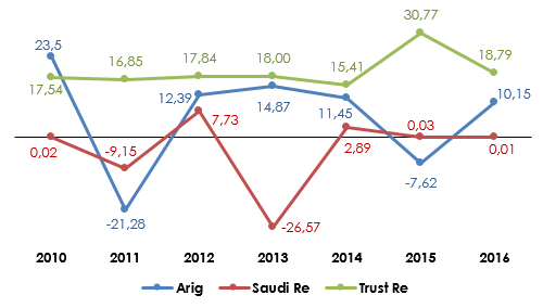 Arig vs Saudi Re vs Trust Re : évolution du résultat net (2010-2016)