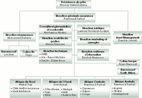 - le pôle assurance qui a été restructuré autour de quatre zones: Afrique du Nord, Afrique de l’Ouest, Afrique Centrale et Afrique Australe Font également partie du pôle assurance, la direction Asset Management, la réassurance ainsi que six autres directions centrales. La zone Afrique du Nord réunit principalement les activités d’assurance marocaine, concentrées autour des sociétés CNIA SAADA et Issaf Assistance.