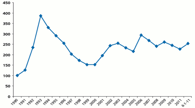Evolution du ratio combiné pour la période 2001–2011 (moyenne des 24 réassureurs notés par Fitch au premier semestre 2011)
